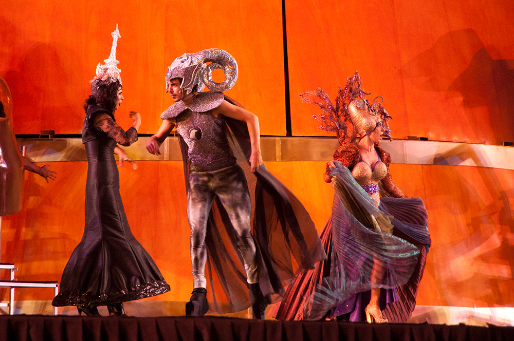 Y sigue la fiesta del vino con la que, para mí, fue la mejor parodia de las tres. La Madre Cepa anuncia que llegó la hora de elegir a la Reina del vino. Un carro trae desde atrás a las cuatro candidatas. Tiran besos y saludan sutilmente, como esa princesa que se lastimó toda porque había un poroto debajo del colchón sobre el que había dormido. Ya en el escenario, saludan y se pelean por ser una más que la otra. A la hora de la elección, claro, la única que festeja es la elegida, mientras las demás, de los pelos, lloran "¡fraude, fraude!".